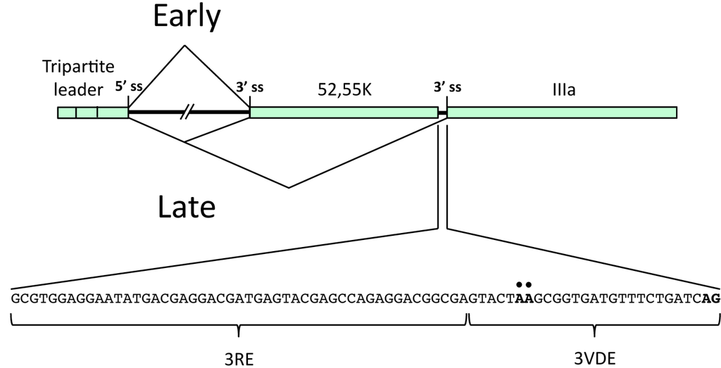 The L1 unit has been extensively used as a model transcript for studies of the temporal control of adenovirus alternative RNA splicing. The results have shown that IIIa splicing is subjected to a tight control by two cis-acting viral elements: the IIIa repressor element (3RE), and the IIIa virus-infection dependent splicing enhancer (3VDE) located in the intron just upstream of the IIIa 3' splice site (Figure 2).