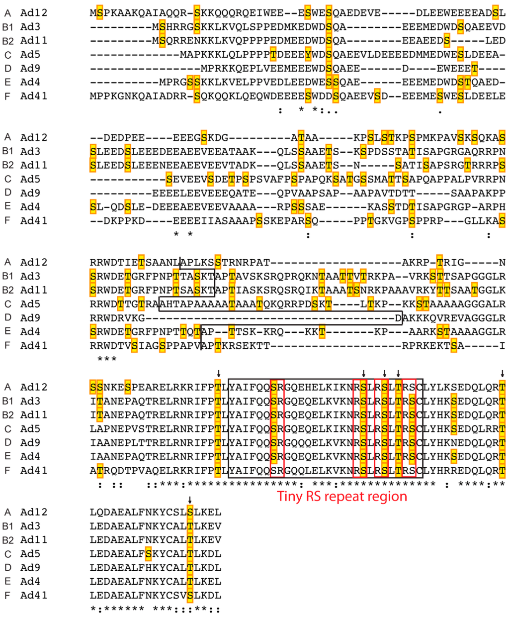 Alignment of L4-33K proteins from different human serotypes and their putative phosphorylation sites. The amino acid sequence of the indicated L4-33K proteins was aligned using Clustal Omega software. The conserved residues are indicated by star (*), colon (:), and period (.) according to the level of identity and similarity of the amino acid aligned: full identity, amino acids with similar characteristics, and weakly similar residues, respectively. The black line separates the N-terminus (shared with the respective L4-22K) and the C-terminal region of each serotype. The putative phosphorylation sites detected with NetPhosK 1.0 are marked in yellow boxes, and the conserved residues predicted to be phosphorylated by the same kinase are indicated by arrows (see also Table S1B). The ds domain is shown with a black-box with the tiny SR repeats indicated in red boxes.