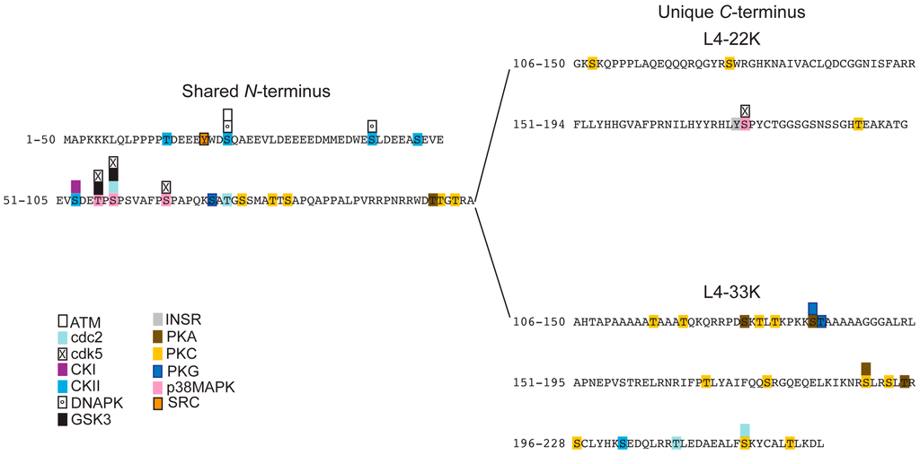 The L4-22K and L4-33K mRNAs encodes for two related proteins that share the first 105 amino acids but have unique C-terminal ends. L4-33K is translated from a spliced mRNA where an intron interrupting the protein coding sequence has been removed whereas L4-22K is translated from the corresponding unspliced mRNA (Figure 3). Further, the 95 amino-terminal amino acids in the L4-22K and L4-33K proteins overlap the carboxy-terminal end of the L4-100K protein in an alternate reading frame. L4-22K and L4-33K have been implicated as factors required for virion assembly [38,39] and appear to be key regulators in the switch from the early-to-late phase of infection.