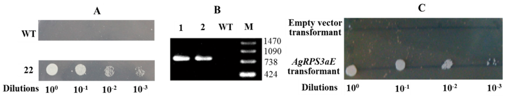 Cloning of the AgRPS3aE gene and verification of salt tolerance. (A) A salt-tolerant transformant was screened from a yeast cDNA expression library on solid SD minimal medium (−uracil, +galactose) containing 20% (w/v) NaCl for 3–5 days at 30 °C; (B) The AgRPS3aE gene was amplified using a salt-tolerant colony as a template. Lane 1, Lane 2: AgRPS3aE gene; Lane M: Marker; and (C) The salt-tolerance properties conferred by the AgRPS3aE gene were verified by the heterologous expression of AgRPS3aE in yeast strain AH109. The empty vector transformant could not survive in a high-salt environment. The transformants were cultivated under 20% NaCl for 3–5 days at 30 °C.