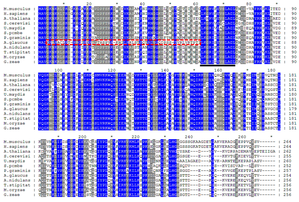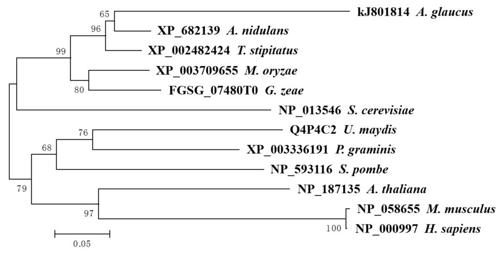 Phylogenetic relationships of AgRPS3aE and RPS3aE from various representative species. A neighbor-jointing tree was constructed with MEGA5.2. Bootstrap values are shown as percentages from 500 replications at branch points. The estimated genetic distance between sequences is proportional to the lengths of the horizontal lines connecting one sequence to another. The GenBank accession numbers of all RPS3aE genes are followed by their species names. A. glaucus: Aspergillus glaucus, A. nidulans: Aspergillus nidulans, T. stipitatus: Talaromyces stipitatus, M. oryzae: Magnaporthe oryzae, G. zeae: Gibberella zeae, S. cerevisiae: Saccharomyces cerevisiae, U. maydis: Ustilago maydis, P. graminis: Puccinia graminis, S. pombe: Schizosaccharomyces pombe, A. thaliana: Arabidopsis thaliana, H. sapiens: Homo sapiens, M. musculus: Mus musculus.