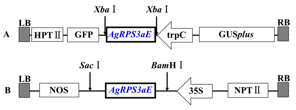 Construction of vectors containing AgRPS3aE for transformation. (A) T-DNA map of the binary vector pGFPGUSplus-trpC::AgRPS3aE used to transform M. oryzae; (B) T-DNA map of the binary vector pBI121::AgRPS3aE used for the Arabidopsis and tobacco transformations. GFP: green fluorescent protein gene; HPTII: hygromycin resistance gene; GUSplus: β-glucuronidase gene; trpC: A. nidulans TrpC promoter; 35S: CaMV 35S promoter; NOS: NOS terminator; NPTII: kanamycin resistance gene.