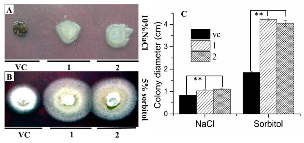 Assay for osmotic stress resistance in AgRPS3aE-transformed M. oryzae. The transformants were incubated on CM containing 10% NaCl (A) or 5% sorbitol (B) for seven days at 28 °C; (C) The response bar graph for colony diameter was measured to illustrate the osmotic stress resistance of AgRPS3aE-transformed M. oryzae. The numbers 1 and 2 represent two different transgenic strains. ** indicates a significant difference at p < 0.01.
