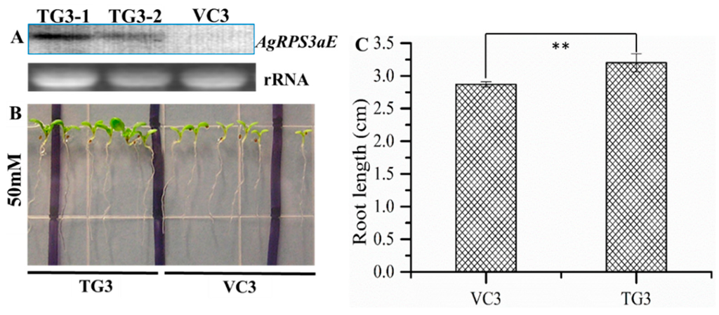Effect of AgRPS3aE overexpression on salt tolerance in transgenic Arabidopsis. (A) Northern blotting analysis of three independent T3 generation transgenic Arabidopsis lines; (B) The performance comparison of T3 and VC3 Arabidopsis seedlings stressed by 50 mM NaCl for 15 days; (C) The response bar graph for root length was calculated to illustrate the salt tolerance of AgRPS3aE transgenic Arabidopsis. The data presented are the means ± SD of three replications. ** indicates a significant difference at p < 0.01.