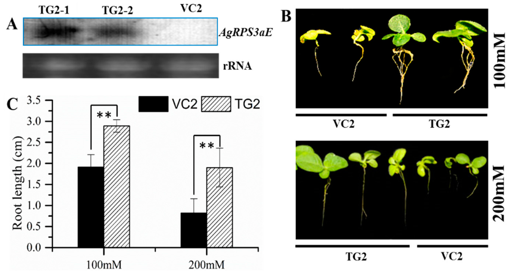 Effect of salt stress on tobacco seedlings from VC2 and T2 progenies of transgenic lines overexpressing AgRPS3aE. (A) Northern blotting analysis of three independent T2-generation transgenic tobacco lines; (B) The phenotypes of VC2 and T2 progenies tobacco seedlings stressed with 100 mM or 200 mM NaCl for 15 days; (C) The root lengths of VC2 and T2 progenies tobacco seedlings stressed with 100 or 200 mM NaCl for 15 days. The data are presented as the means ± SD of three replications. Significant differences of the VC2 and T2 progenies root lengths in tobacco seedlings are indicated as ** p < 0.01.