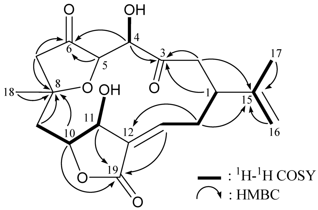 The relative configuration of 2 observed in the NOESY spectrum corroborated the MM2 force field calculations which suggested the most stable conformation as shown in Figure 2 [16]. In the NOESY experiment for 2, it was found that one of the methylene protons at C-14 (δH 3.64) exhibited a correlation with H-1, but not with H-13, and therefore it was assigned as H-14β, and the other C-14 proton (δH 2.41) as H-14α. H-13 showed correlations with H-11 and H-14α, but not with H-1, and H-10 showed a correlation with H-11, as well as the lack of coupling was detected between H-10 and H-11, indicating the dihedral angle between H-10 and H-11 is approximately 90° and the configurations of chiral carbons C-10 and C-11 were assigned as S*- and R*-forms, respectively. One proton of C-9 methylene (δH 2.52) correlated with H-10 and H3-18, but not with H-11, and H3-18 showed a correlation with H-5, indicating that Me-18 and H-5 were β-oriented. A correlation was detected between OH-4 and H-11, indicating that the hydroxy group at C-4 should be α-oriented by modeling analysis. From the above evidences, the relative configurations of the chiral carbons of 2 were assumed to be 1R*, 4S*, 5S*, 8R*, 10S* and 11R*.