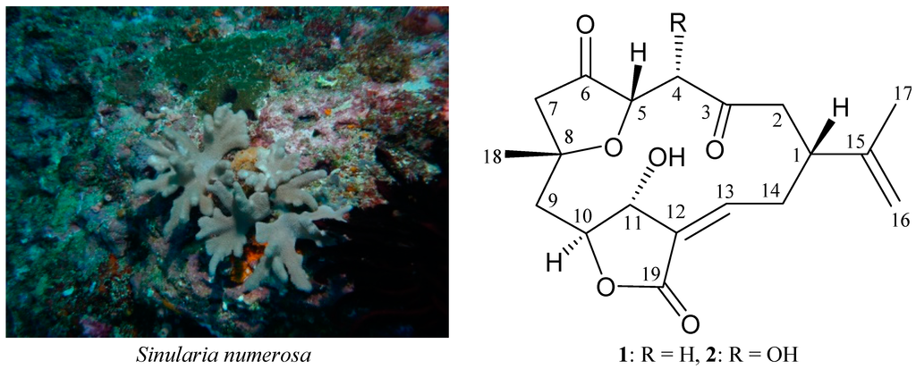 The soft coral Sinularia numerosa and the structures of 5-episinuleptolide (1) and 4α-hydroxy-5-episinuleptolide (2).