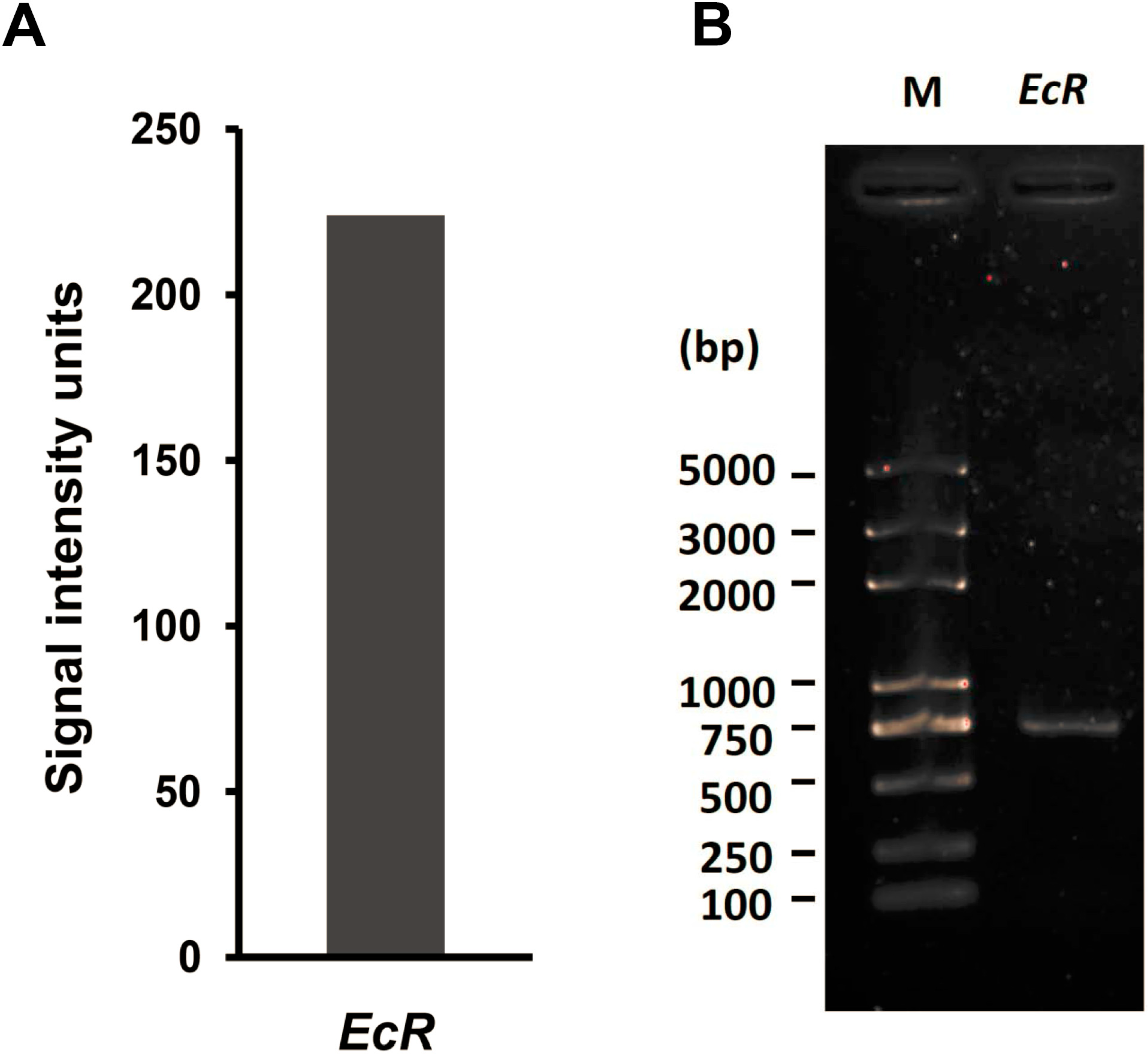 EcR expression in BmN4 cells. (A) Microarray data of mRNA expression of silkworm EcR gene in BmN4 cells; (B) Quantitative RT-PCR detection of mRNA expression of silkworm EcR gene in BmN4 cells. M: Molecular weight marker.
