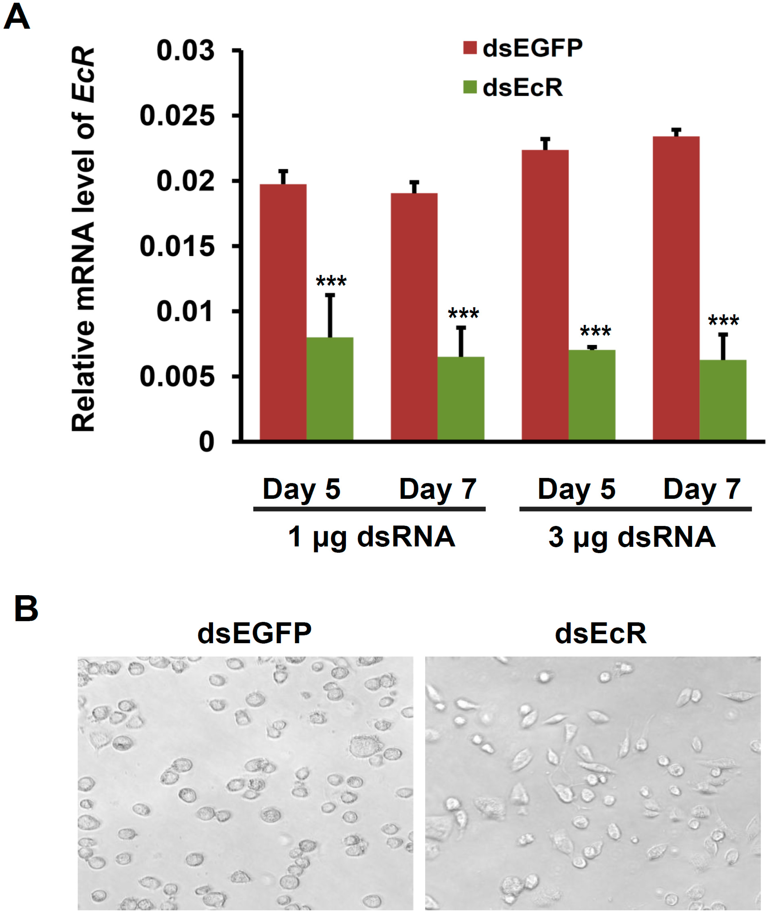 EcR RNAi changes the shape of BmN4-SID1 cells. (A) Quantitative RT-PCR assay of RNAi-based knockdown efficiency of EcR expression in silkworm BmN4-SID1 cells. EGFP RNAi was used as control. Error bars represents mean and S.D., *** p < 0.001, compared with the control; (B) Effects of EcR RNAi on the shape of BmN4-SID1 cells. The BmN4-SID1 cells were checked on the seventh day after the treatment with different dsRNA (dsEcR for EcR gene or dsEGFP for EGFP gene) using microscope.