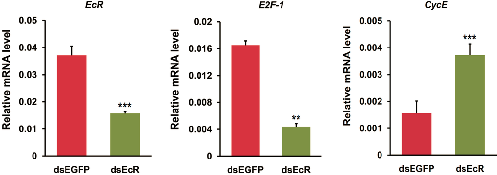 EcR RNAi changes the expression of cell cycle genes in BmN4-SID1 cells. The expression changes of cell cycle genes (E2F-1 and CycE) after the RNAi of EcR and EGFP in silkworm BmN4-SID1 cells were examined using quantitative RT-PCR. Error bars represents mean and S.D., ** p < 0.01, *** p < 0.001, compared with the control.