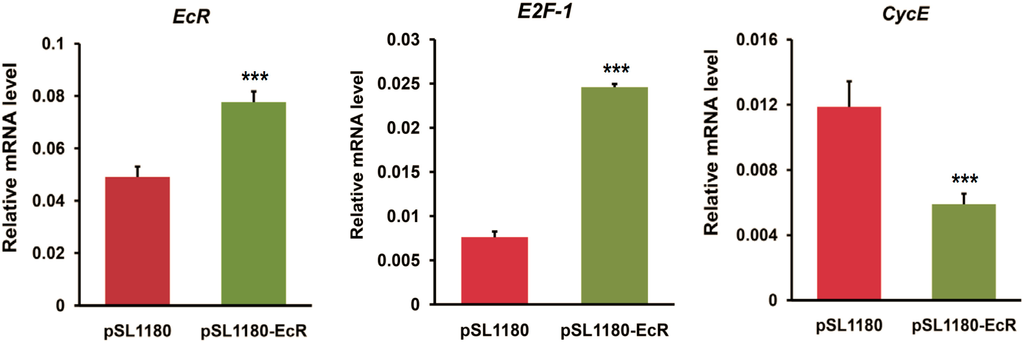 EcR overexpression disrupts the expression of cell cycle genes in BmN4 cells. The expression changes of cell cycle genes (E2F-1 and CycE) after the overexpression of EcR gene in silkworm BmN4 cells were examined using quantitative RT-PCR. Expression vector excluding EcR gene was used as control. Error bars represents mean and S.D., *** p < 0.001, compared with the control.