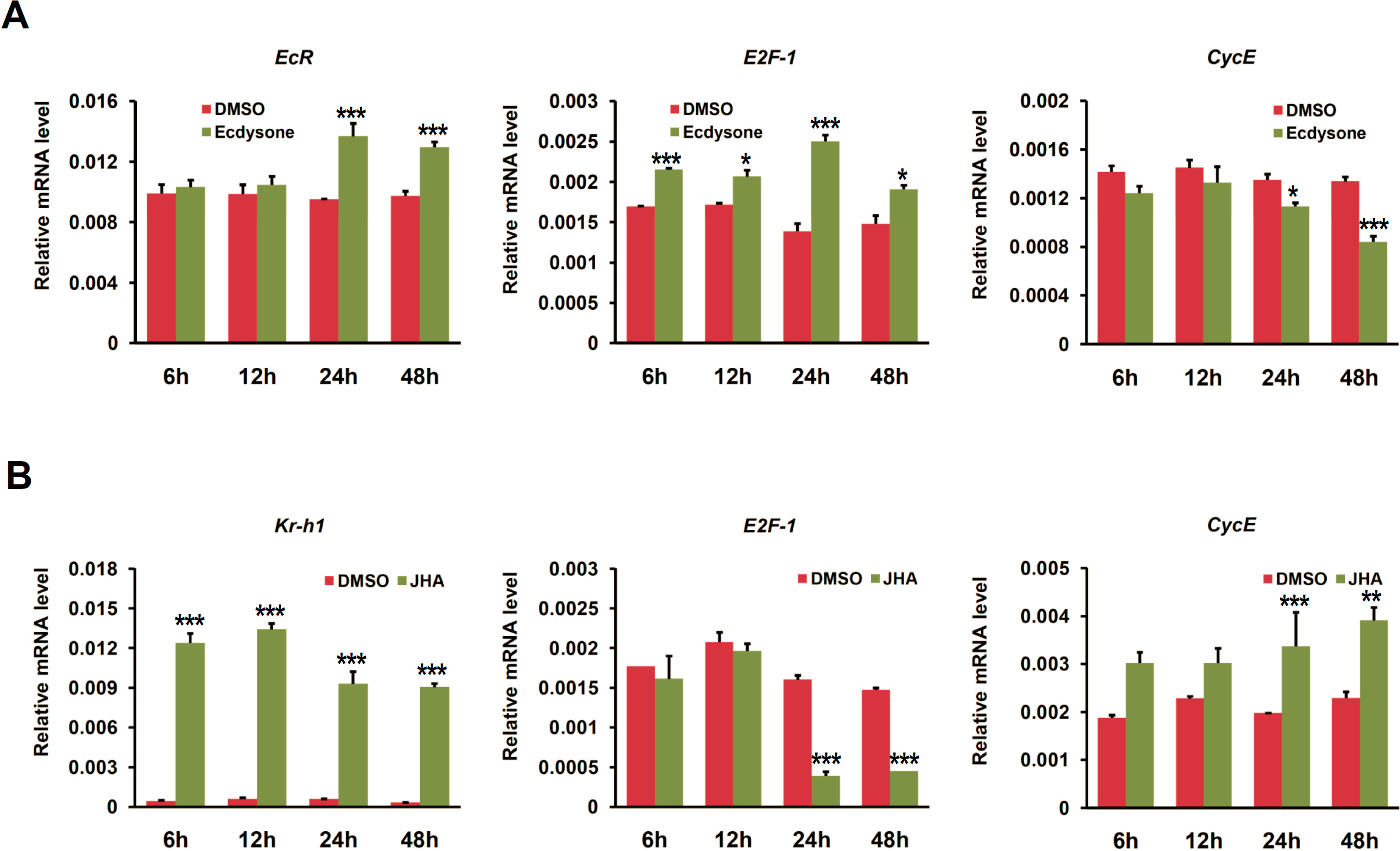 Given that EcR is a key receptor in mediating ecdysone signaling in insects [1], we further examined the effects of ecdysone application on the expression of cell cycle genes in BmN4 cells. We firstly checked time-dependent effects of ecdysone treatment with a dosage of 1 μg per mL per plate well on the transcription of cell cycle genes. As shown in Figure 5A, EcR expression was significantly up-regulated after 24 h with ecdysone treatment. Further examination revealed that E2F-1 expression was remarkably elevated at 6 h after ecdysone treatment and CycE was inhibited at 24 h (Figure 5A). In addition, given that the role of juvenile hormone (JH) is antagonistic to that of ecdysone in controlling developmental processes in insects [34,35], we also checked the effects of JH analog (JHA) on the expression of cell cycle genes in BmN4 cells. In our experiment, the dosage of JHA is 1 μg per plate well. Obviously, Kr-h1 gene, a key transcription factor that is activated by JH and is involved in JH signaling [36,37], was up-regulated in BmN4 cells at 6 h after JHA treatment (Figure 5B). E2F-1 and CycE were significantly down- and up-regulated after 24 h with JHA treatment, respectively, which is consistent with the observation in EcR RNAi, but converse with the effects of either EcR overexpression or ecdysone application.
