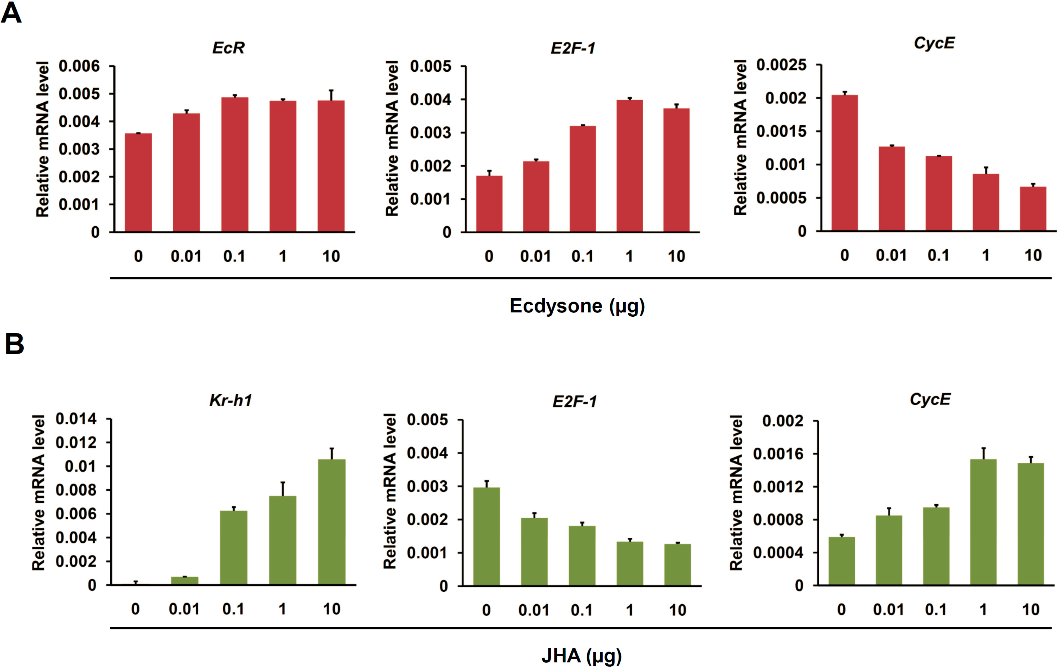 Dosage-dependent expression changes of cell cycle genes induced by ecdysone in BmN4 cells. (A) Dosage-dependent expression changes of cell cycle genes (E2F-1 and CycE) after ecdysone treatment in silkworm BmN4 cells were examined using quantitative RT-PCR. Ecdysone treatment was initiated with different dosage, including 0, 0.01, 0.1, 1, and 10 µg per plate well. The cells were collected at 24 h after ecdysone treatment for further analysis; (B) Dosage-dependent expression changes of cell cycle genes (E2F-1 and CycE) after the treatment of JHA as ecdysone antagonists were tested by quantitative RT-PCR. The analyzing approach for JHA treatment was same as ecdysone treatment.
