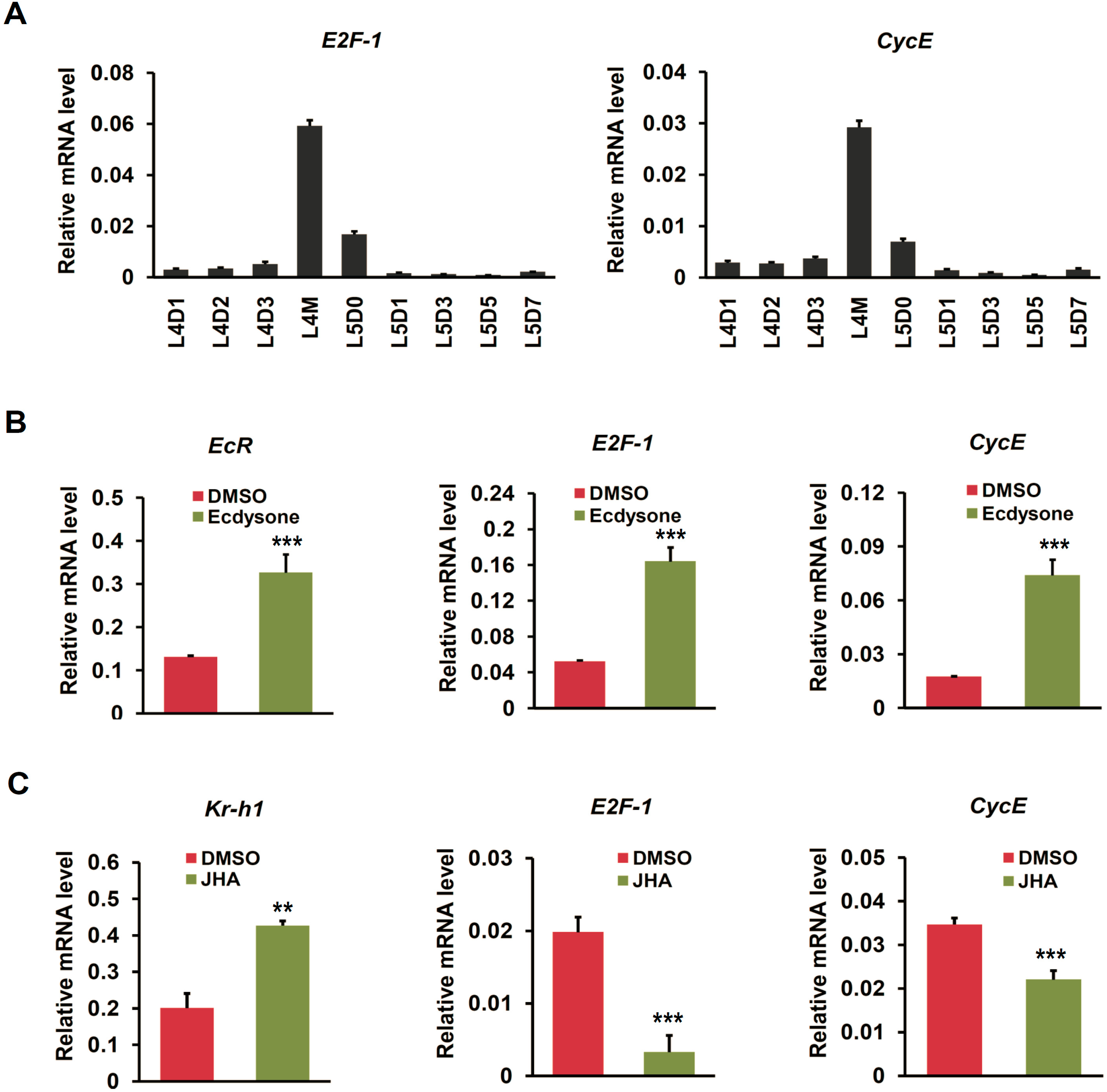 Ecdysone-induced changes in the expression of cell cycle genes in silkworm silk gland. (A) Expression patterns of cell cycle genes (E2F-1 and CycE) in silk gland during silkworm larval molting. Nine developmental time points, including L4D1, L4D2, L4D3, L4M, L5D0, L5D1, L5D3, L5D5, and L5D7, were selected; (B) The expression changes of cell cycle genes (E2F-1 and CycE) at 12 h after ecdysone treatment on 1-day-old fourth instar silkworm larvae were examined using quantitative RT-PCR. Error bars represents mean and S.D., ** p < 0.01, *** p < 0.001, compared with the control; (C) The expression changes of cell cycle genes (E2F-1 and CycE) at 12 h after JHA treatment on 1-day-old fourth instar silkworm larvae were examined.