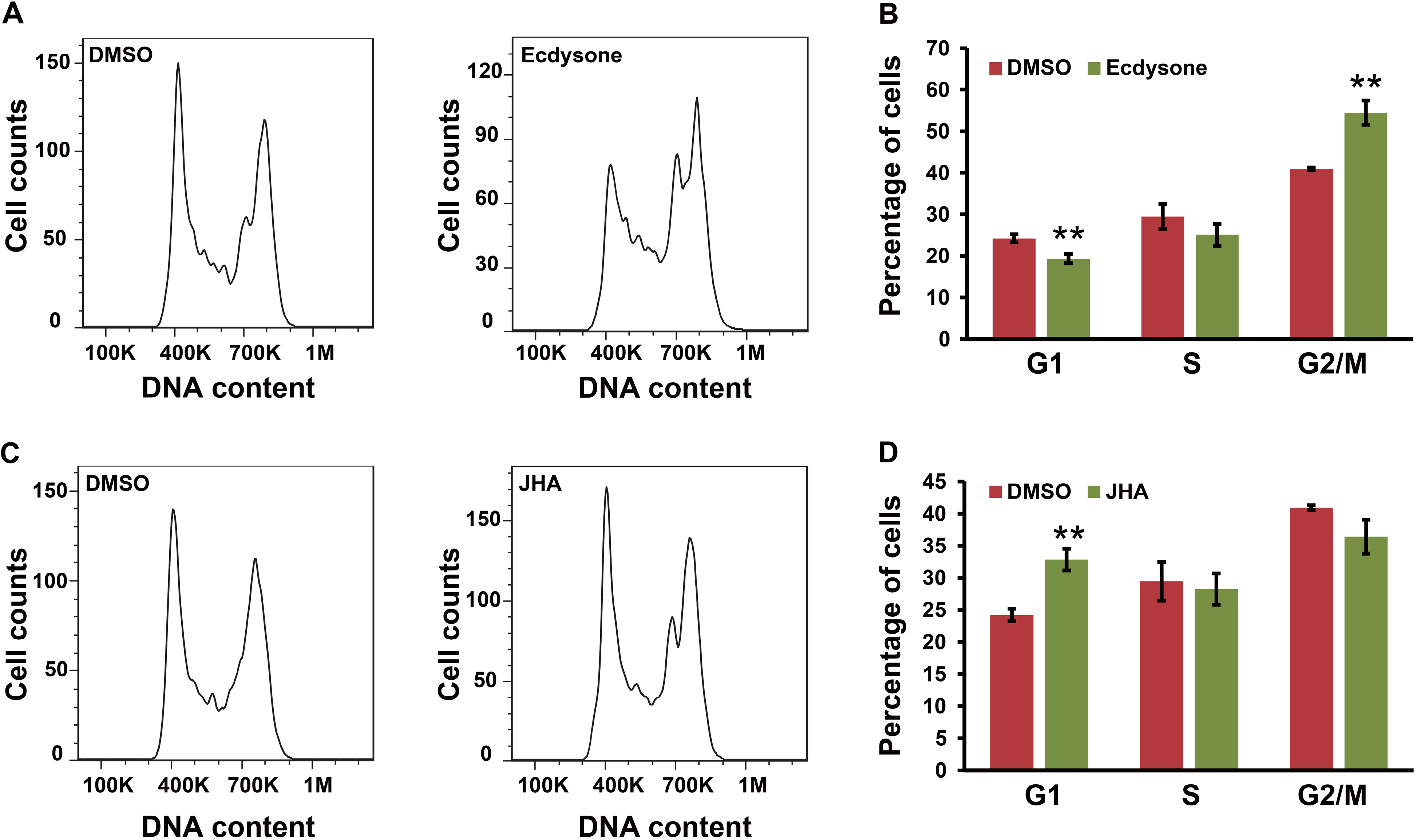 Ecdysone and JHA treatment induce cell cycle arrest. (A,B) Effect of ecdysone on cell cycle progression in BmN4 cells. At 24 h after ecdysone treatment, BmN4 cells were stained with Cell Cycle and Apoptosis Analysis Kit and subsequently detected by flow cytometry; (C,D) Effect of JHA on cell cycle progression in BmN4 cells. Similarly, at 24 h after JHA treatment, BmN4 cells were stained with Cell Cycle and Apoptosis Analysis Kit and subsequently detected by flow cytometry. Error bars represents mean and S.D., ** p < 0.01, compared with the control.