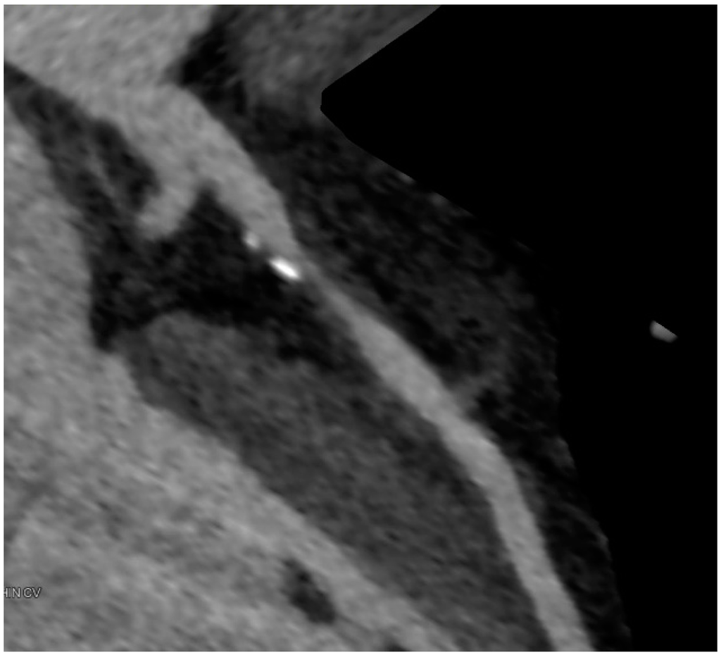Coronary artery calcification (CAC) is a frequent pathology seen in CT scans (Figure 1). The amount of calcium is quantified using the Agatston-Score [7]. It is correlated with the extent of atherosclerotic plaque burden [8]. In most patients presenting with acute coronary syndromes or sustaining sudden cardiac death, calcifications in the coronary artery wall can be detected [9,10]. A high amount of calcium, however, does not necessarily correlate with angiographic luminal stenoses, nor is there a fixed relationship with vulnerability of plaques [11]. Vice versa, a lack of coronary calcium makes stenotic lesions unlikely, but it is not possible to definitely rule out coronary stenoses [12,13].