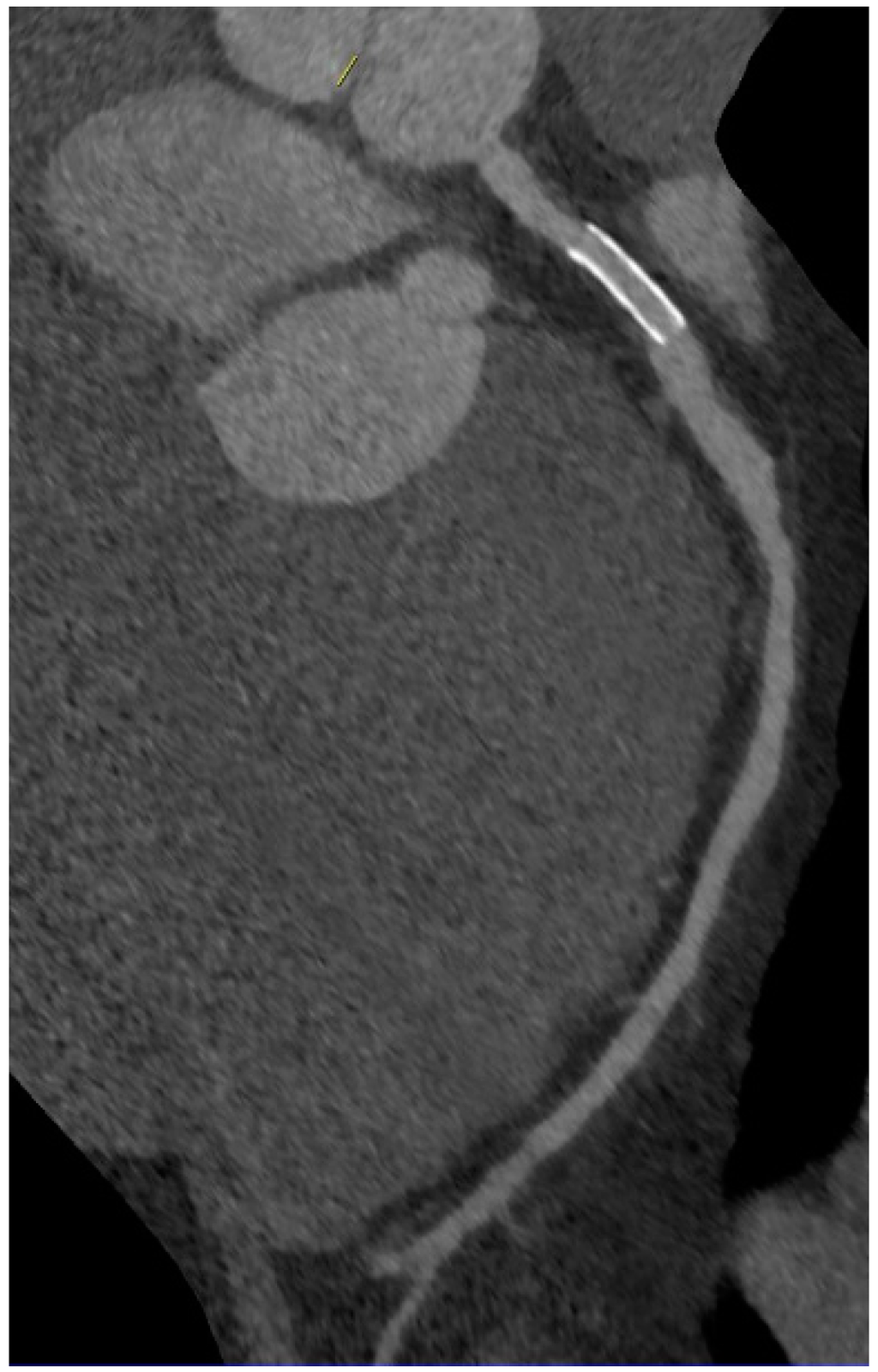 LAD after revascularization with a patent drug eluting stent showing a very good result 18 months after implantation.