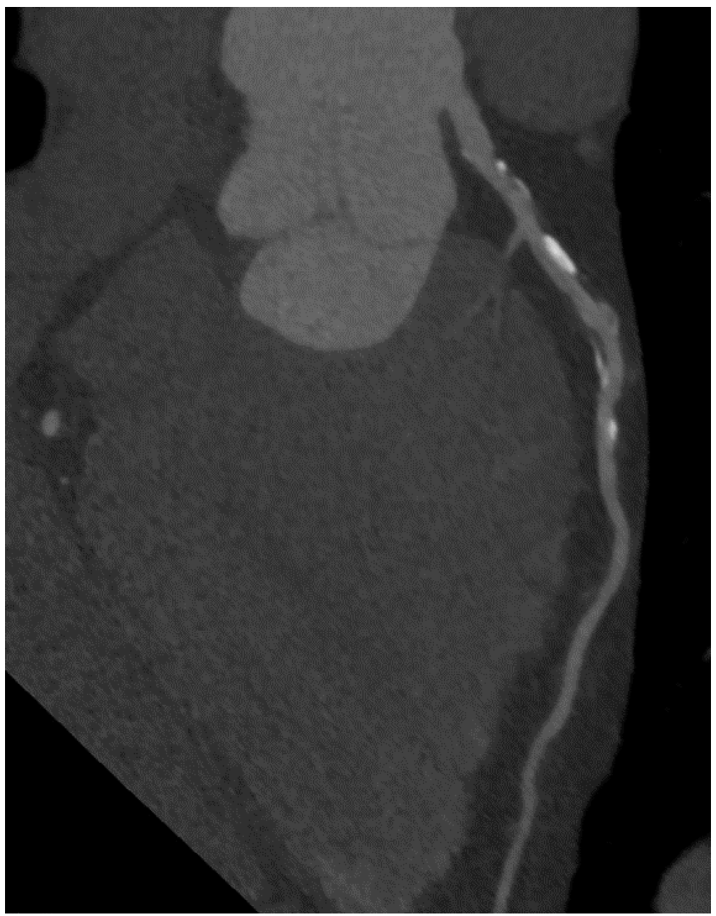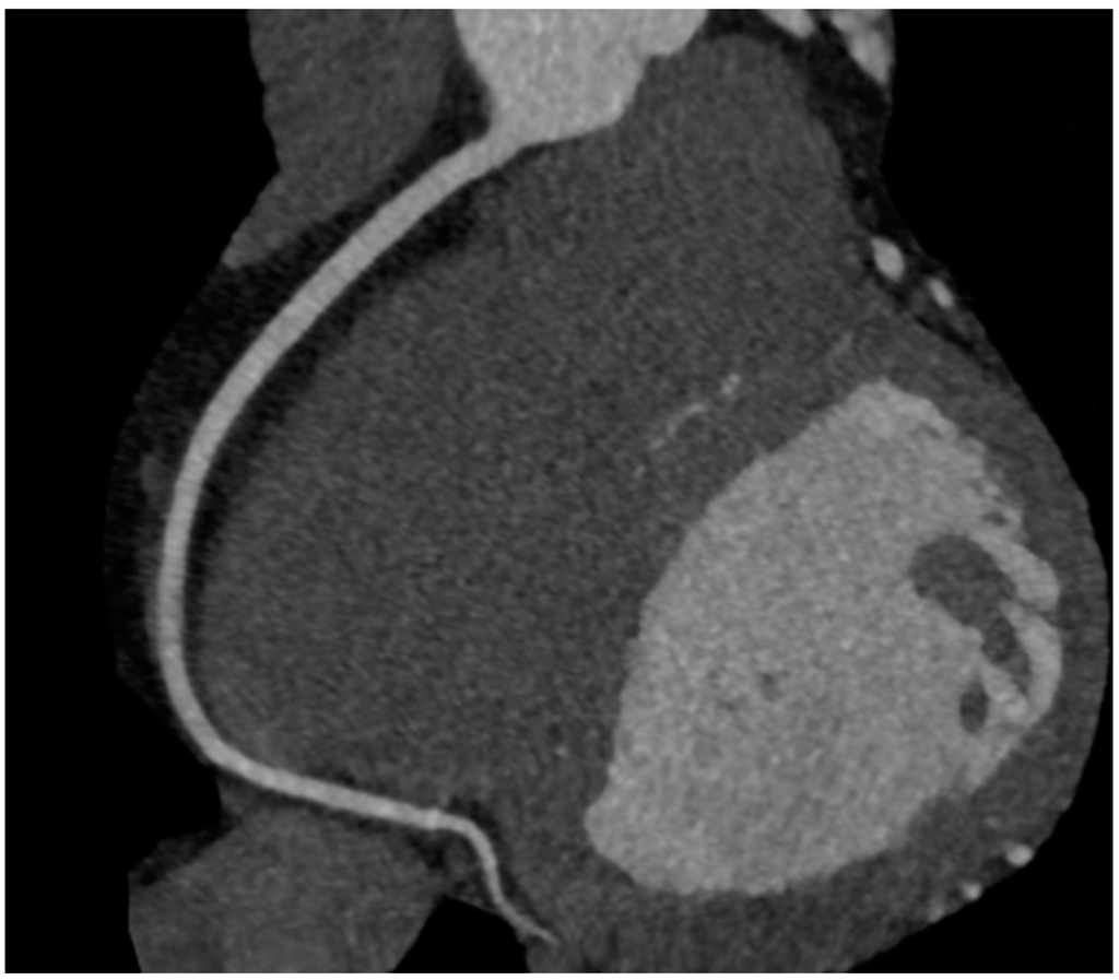 When performing CCTA in patients with intermediate risk for CAD, a substantial portion of the patients show coronary plaques (Figure 5). Hausleiter et al. assessed 161 patients of whom almost 30% had noncalcified plaques; most had both noncalcified and calcified plaques. In this group, 6% had plaques without any calcification [31]. Several studies compared the diagnostic accuracy of detecting coronary artery stenoses compared to invasive angiography [32], some additionally with intravascular ultrasonography (IVUS) [33,34,35]. Sensitivity for detection of plaques range above 90%, negative predictive values approach 100% in patients with low to intermediate probabilities of CAD. CCTA is a reliable method, especially for ruling out relevant plaques and stenoses in coronary arteries (Figure 6). One major limitation is a reduced ability to reliably quantify the degree of stenoses [36] which is the reason for lower positive predictive values and specificity due to the fact that stenoses tend to be overestimated in CCTA especially in calcified lesions. Specificity ranges between 64% and 87%, depending on patient characteristics such as obesity or calcification [32,35,37]. A recent meta-analysis comprised 42 studies in which CCTA was compared to IVUS for detection of any plaques. Sensitivity and specificity were 93% and 92%, respectively [34]. Furthermore, imaging artifacts can lead to misinterpretation. Most of the existing studies were, however, performed using 64-slice CCTA. Technology has remarkably improved in the last decade so that dual-source scanners with 2 × 128 slices and more are the technical standard at present. In a meta-analysis by Voros et al., it could be demonstrated that sensitivity improves from 84% to 94% when images are obtained with 64-slice scanners compared to 16-slice scanners [38]. Still, different attenuation values inside the same plaques (fibrous, lipid-rich, necrotic and calcified) make the classification and reproducibility of lesions challenging.
