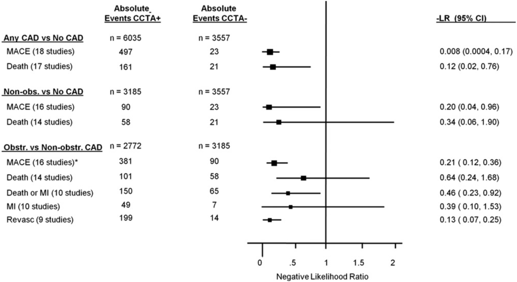 The ROMICAT-Trial described an excellent sensitivity (100%) of diagnosing CAD in patients presenting with chest pain at low to intermediate pretest probability [66]. Fifty percent of all patients had no CAD at all. Patients were followed-up for two years regarding major adverse cardiac events (MACE) [67]. Patients with no CAD in CCTA had no risk for MACE in the following two years whereas risk was 4.6% in nonobstructive CAD and 30.3% in obstructive CAD. A limitation was that almost 10% of patients were lost to follow-up.