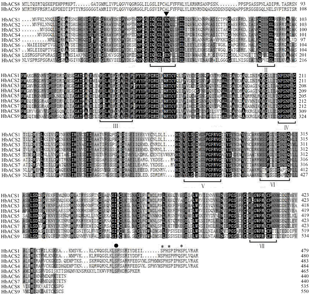 Amino acid sequence alignment of HbACS genes. The conserved glutamate residue (E) marked with an arrowhead is involved in substrate specificity. The seven highly conserved regions (I–VII) among all ACC synthases are underlined. Ser residues implicated in calcium-dependent protein kinase (CDPK) and mitogen-activated protein kinase (MPK6) phosphorylation are marked by a black dot and asterisks, respectively.