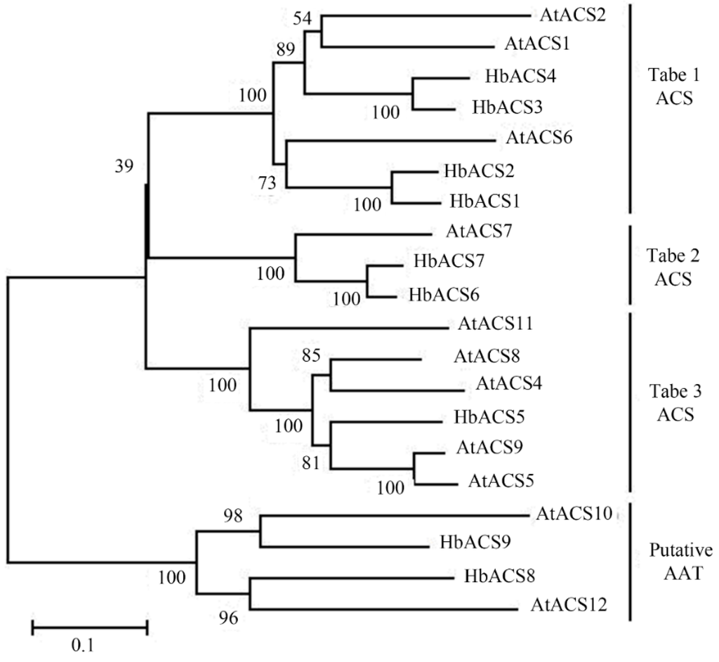 Multi-gene families encoding ACS have been cloned and characterized from various plant species. Genome screening results have revealed the existence of 12 ACS genes in Arabidopsis, 6 ACS genes in rice, 10 ACS genes in grapevine, and 11 ACS genes in poplar [29]. Thus far, ACS genes from the rubber tree have not been completely cloned and investigated, although these genes may be implicated in regulating the development and latex regeneration of Hevea [19,20,21]. In this study, at least nine ACS-like genes were found in rubber tree; Sequence and phylogenetic analysis results showed that seven isozymes of these ACS-like genes (HbACS1–7) were similar to the eight AtACS isozymes with ACS activity [7].
