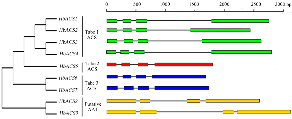 Neighbor-joining phylogenetic tree and intron-exon structures. The phylogenetic tree (part of the left side) was constructed from HbACSs using the MEGA 6.0 program with the NJ method. Intron and exon structural organization of HbACS genes are described on the right side. Introns and exons are represented by black lines and colored boxes, respectively.