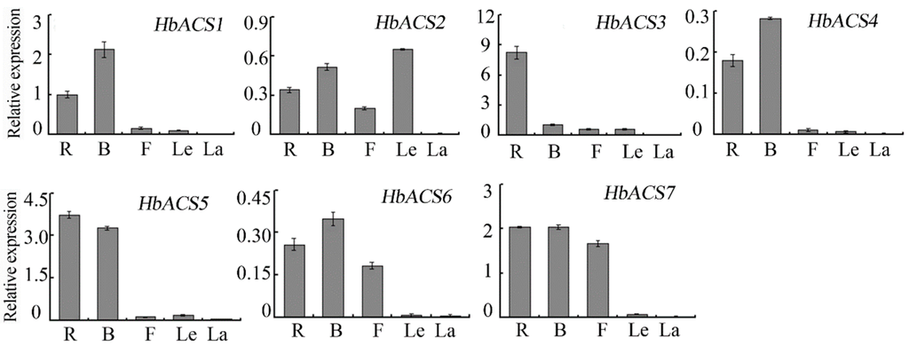 HbACS gene expression in various tissues, i.e., roots (R), barks (B), flowers, leaves (Le) and latex (La). Data are means ± standard error calculated from three independent biological replicates.
