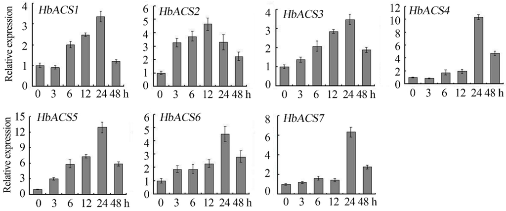 Expression of the HbACS genes in the bark after ethrel was applied. Data are means ± standard error calculated from three independent biological replicates.