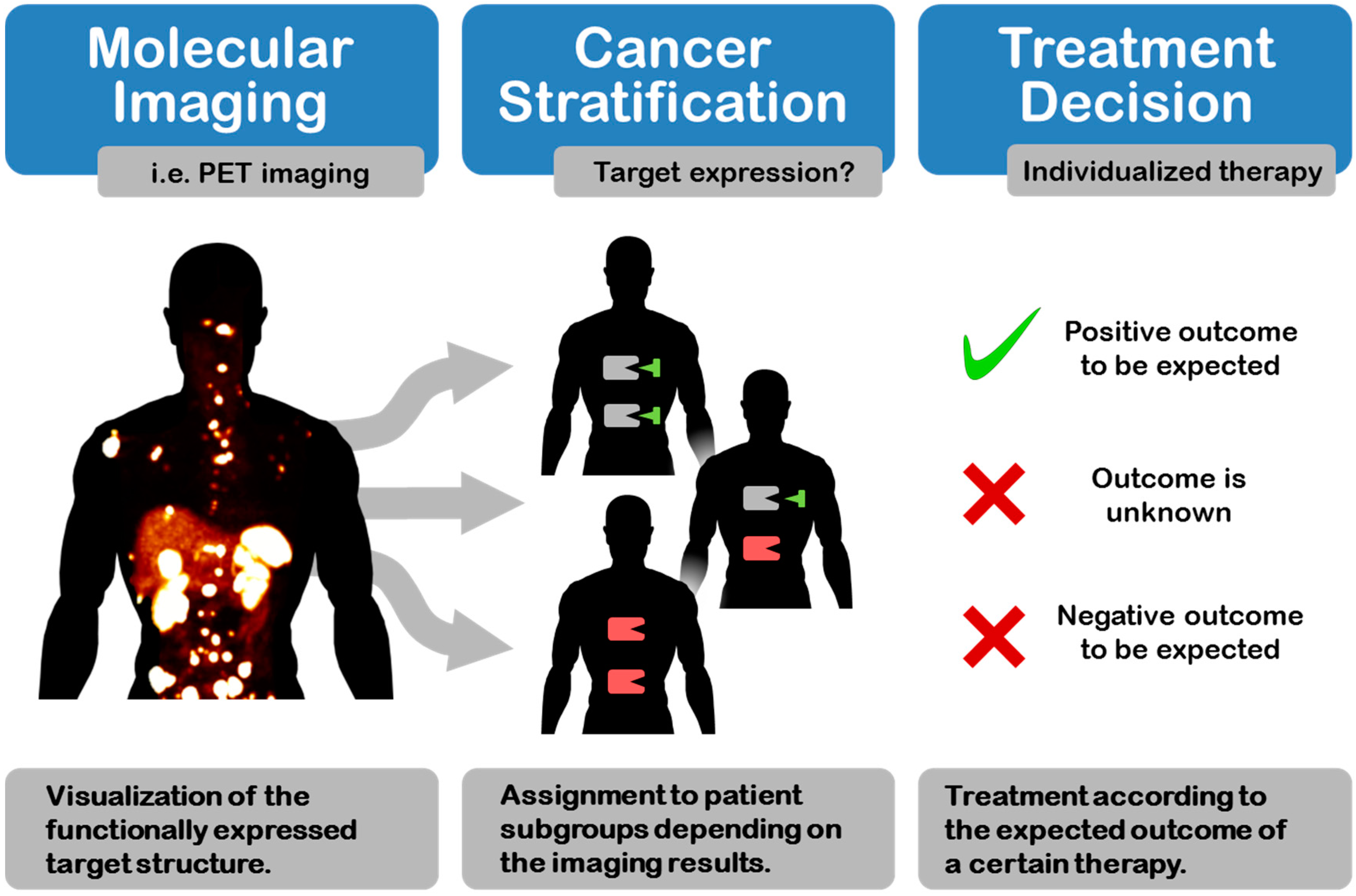 Cancer stratification by molecular imaging allows patients clustering according to the expected outcome of a therapeutic approach by visualizing an expressed biomarker. The resulting patient subgroups can subsequently be treated with the most promising therapy [6].