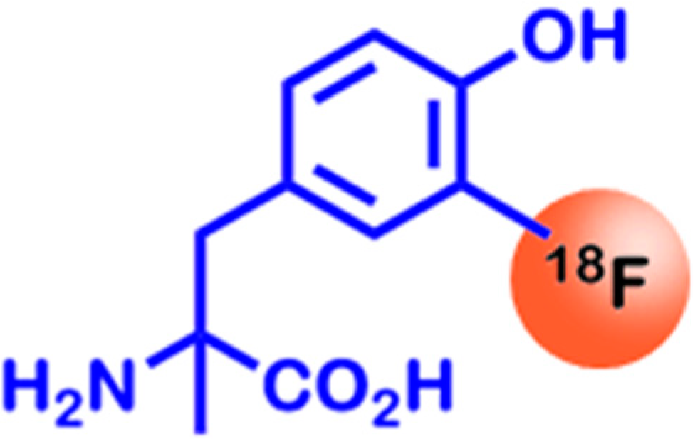 Chemical structure of l-[3-18F]-α-methyl-tyrosine, a PET tracer specifically taken up via amino acid transporters, which are overexpressed in many types of cancer.