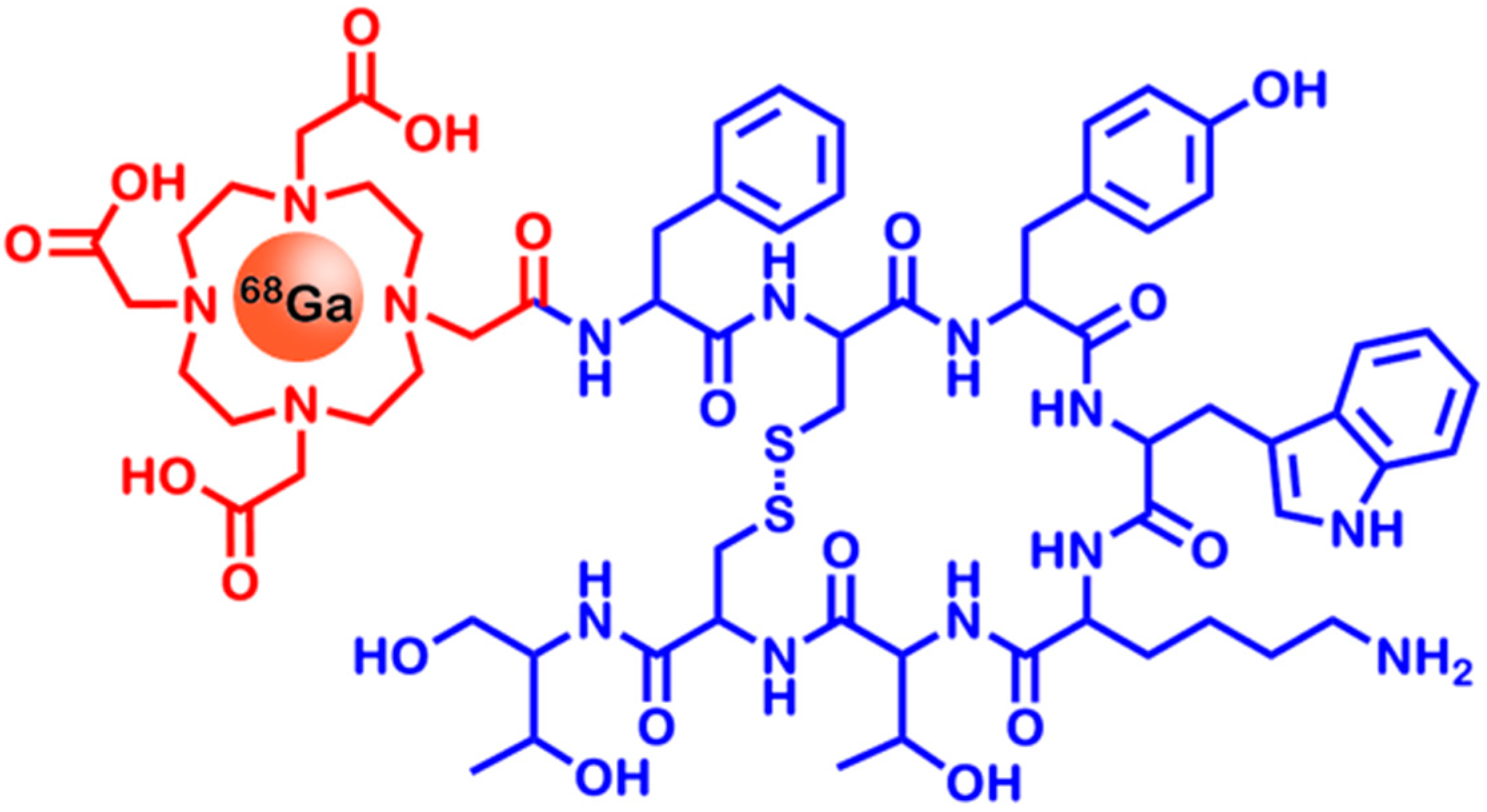 Chemical structure of [68Ga]-DOTATOC (DOTA(0)-Phe(1)-Tyr(3))octreotide). It shows high affinity to SSTR2 (Somatostatin Receptor 2)—a receptor overexpressed in neuroendocrine tumors. The blue portion of the molecule is responsible for the SSTR2 specificity, whereas the radionuclide 68Ga contained in the chelator DOTA (red) acts as the signal source for PET imaging. For reasons of clarity, chelation bonds are omitted.