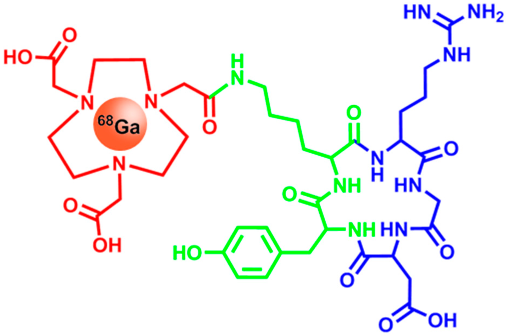 Chemical structure of [68Ga]-NOTA-c(RGDyK) (NOTA-Cyclo [Arg-Gly-Asp-d-Tyr-Lys]), which is used for the molecular imaging of αvβ3 integrin overexpressing tumors. 68Ga functions as the signal source for molecular imaging and is chelated to NOTA (red) to prevent displacement of the imaging moiety. The RGD-motif (Arg-Gyl-Asp, blue) is responsible for the integrin interaction. Insertion of d-tyrosine and cyclization reduce the protease digestibility of the compound, while lysine enables the correct positioning of the imaging moiety. For reasons of clarity, chelation bonds are omitted.