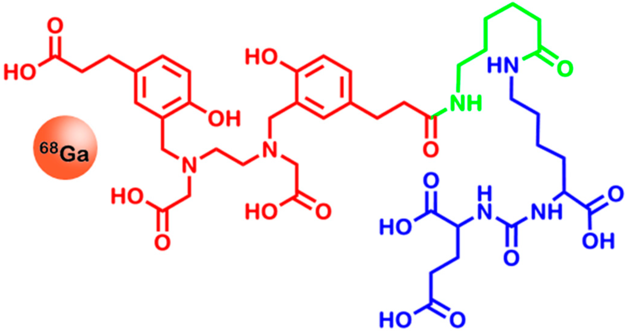 Chemical structure of [68Ga]-PSMA-HBED-CC. The Glu-urea-Lys sequence (blue) is responsible for the targeting properties of the tracer. It is linked to the 68Ga-labeledchelator HBED-CC (red) via an aminocaproic acid linker (green). For reasons of clarity, chelation bonds are omitted.