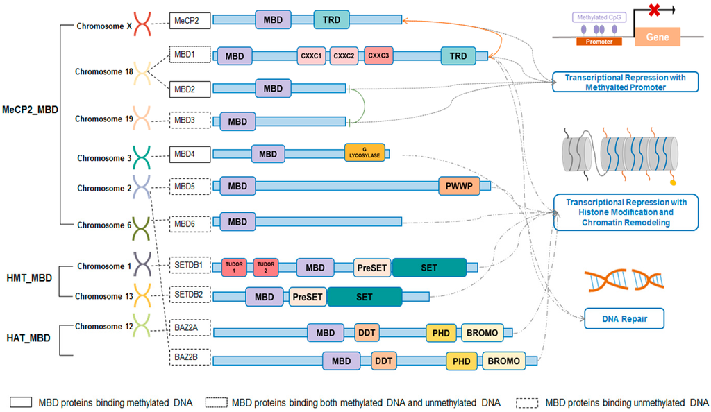 - Hung, M.S.; Shen, C.K. Eukaryotic methyl-CpG-binding domain proteins and chromatin modification. Eukaryot. Cell 2003, 2, 841–846. [Google Scholar] [CrossRef] [PubMed]