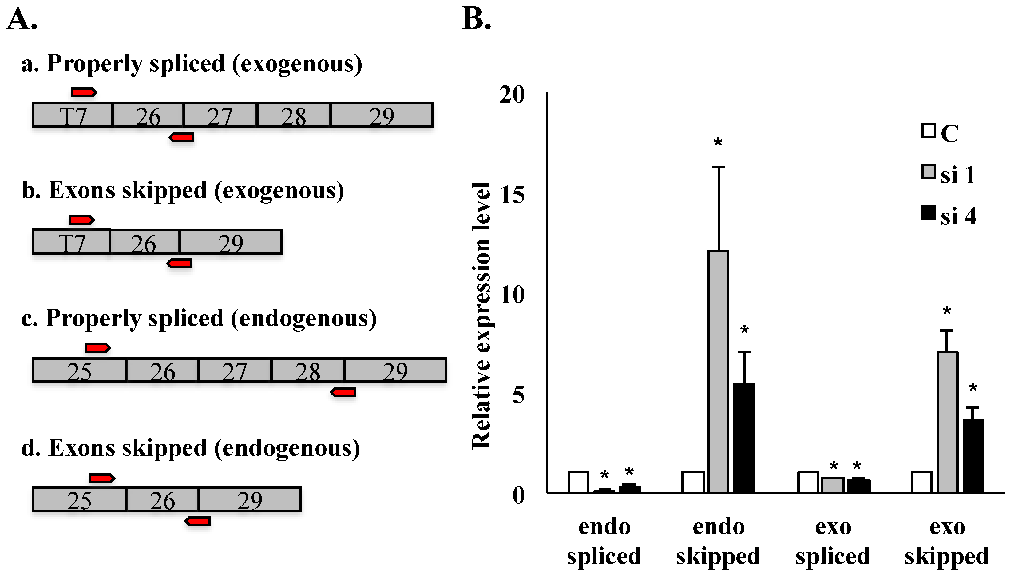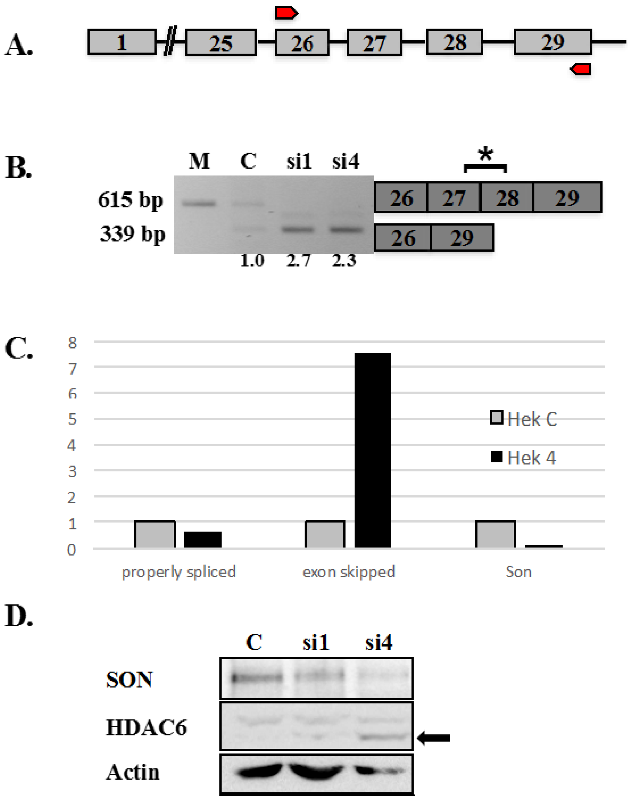 qRT-PCR analysis of HDAC6 exon skipping in SON-depleted cells. qRT-PCR performed on HeLa HDAC6 stable cells post-SON depletion. (A) Four sets of exon junction primers indicated by red arrows (see Experimental Section) were used to amplify splice variants of exogenous reporter transcripts as well as of endogenous HDAC6 transcripts; (B) Relative transcript level for properly spliced versus exon skipped transcripts is measured both for endogenous and for exogenous HDAC6 transcripts. Error bars were calculated by measuring standard error from three individual experiments (* p ≤ 0.05).