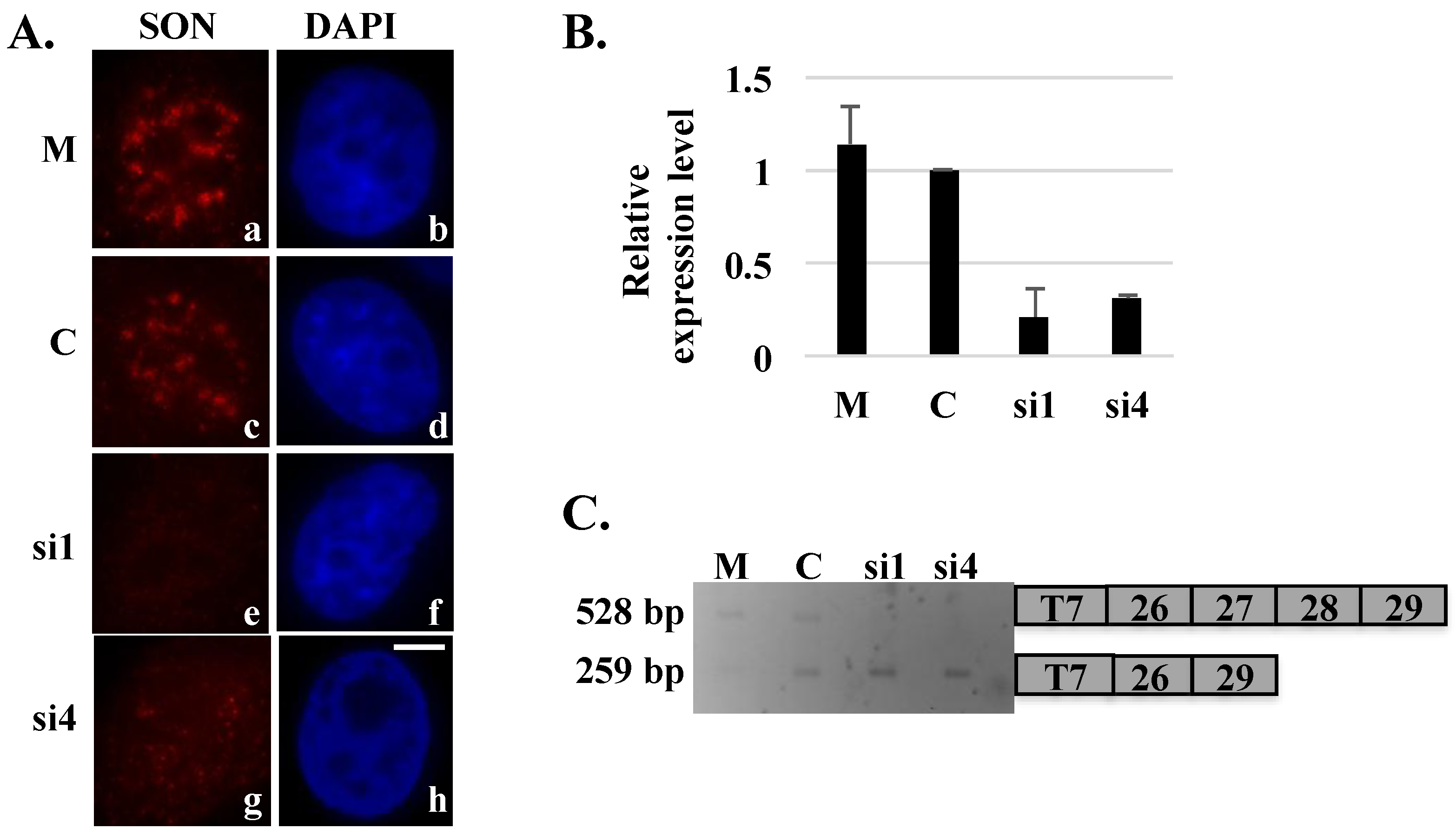 Skipping of exons 27 and 28 of the HDAC6 reporter minigene in SON-depleted cells. HeLa cells transiently transfected with HDAC6 reporter plasmid and treated with mock (M), control (C) or SON siRNA duplexes were either processed for immunofluorescence (A) or harvested to perform qRT-PCR (B) to show SON depletion. Cells treated with SON siRNAs and immunolabeled with anti-SON antibodies in (A) do not show SON labeling in nuclear speckles (e and g) when compared to mock treated (a) or control siRNA-treated (c) cells. DNA was stained with DAPI (b, d, f and h). Scale bar = 5 µm. qRT-PCR in (B) showed reduction of SON mRNA levels in SON siRNA-treated samples compared to mock and control siRNA treated samples; (C) RT-PCR performed using primers that specifically target reporter minigene transcripts shows exon skipping in SON siRNA-treated samples.