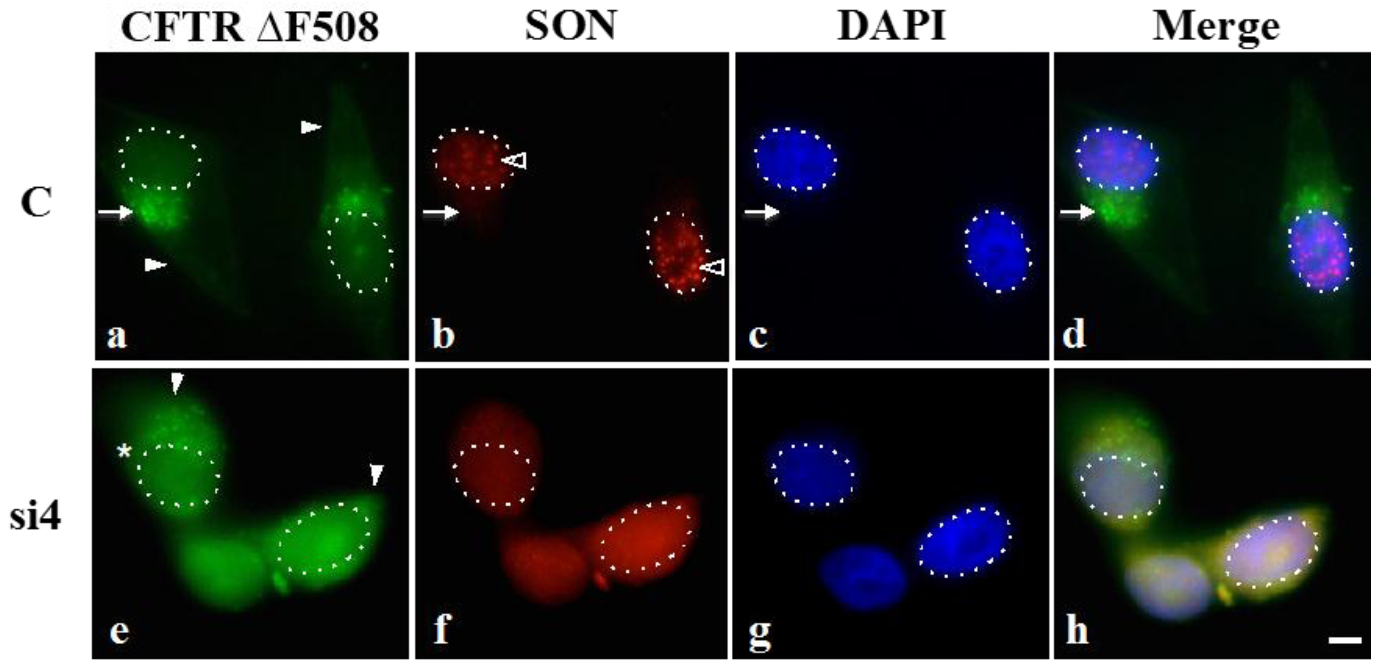 SON depletion reduces HDAC6-mediated aggresome formation. HeLa cells transiently expressing GFP-CFTR ∆F508 were transfected with either control siRNA duplexes (C) or SON siRNA duplexes and then treated with proteasome inhibitor MG132. Immunofluorescence labeling with anti-SON WU14 antibody indicates that SON normally localizes to nuclear speckles (open arrowheads in b) and that SON labeling is reduced in nuclear speckles of cells treated with SON siRNA duplexes (f). DAPI was used to stain DNA (c and g) and used to highlight the nuclear boundary in all panels (dotted lines). Arrow in (a–d) indicates GFP-CFTR ∆F508 localized at aggresomes. Asterisk in (e) marks a SON-depleted cell that retains a few cytoplasmic foci of GFP-CFTR ∆F508 (see Discussion). Filled arrowheads mark GFP-CFTR signal that is more diffuse in the cytoplasm of SON-depleted cells (e) while it is predominantly concentrated at aggresomes in controls (a). Triple merge shown in (d) and (h). Scale bar = 5 µm.