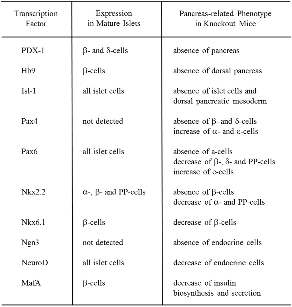 Pancreas-related phenotype in knockout mice of each pancreatic transcription factor.