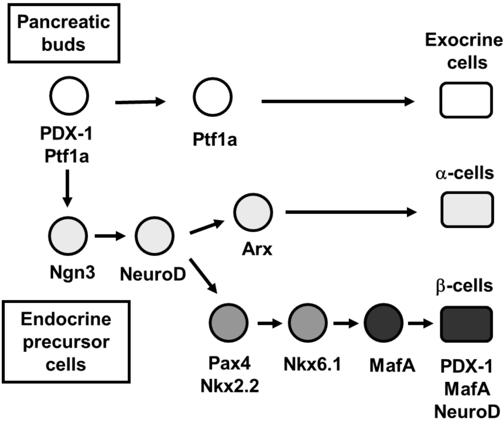 Pancreatic transcription factor hierarchy during pancreas development. It is well known that many transcription factors are involved in pancreas formation and β-cell differentiation. Among the various transcription factors, PDX-1 plays a crucial role in pancreas formation and β-cell differentiation, and maintenance of mature β-cell function. Ngn3 and NeuroD are also important transcription factors for pancreatic endocrine cell differentiation. MafA expression is induced at the final stage of β-cell differentiation and functions as a potent activator of insulin gene transcription.