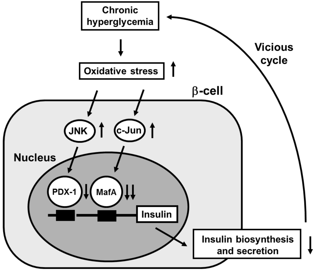 It is well known that pancreatic β-cells secrete insulin when blood glucose levels become high. However, when β-cells are chronically exposed to hyperglycemia, β-cell function gradually deteriorates, which leads to the aggravation of type 2 diabetes. Once hyperglycemia becomes apparent, β-cell function such as insulin biosynthesis and secretion progressively deteriorates. This process is known as β-cell glucose toxicity which is often observed under diabetic conditions. In the diabetic state, hyperglycemia per se and subsequent induction of oxidative stress decrease insulin biosynthesis and secretion and finally bring about apoptosis [76,77,78,79,80,81,82,83,84,85,86,87,88,89,90,91,92,93,94,95,96,97].