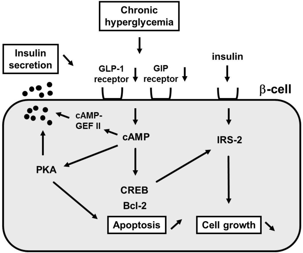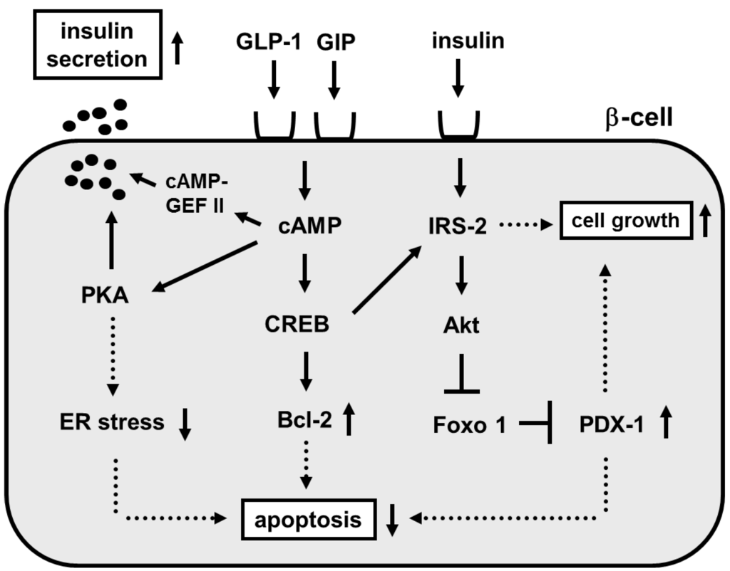 The incretin effect causes more insulin to be secreted when glucose is orally taken compared to when given intravenously even when blood glucose levels have the same profile. This effect is thought to be very important for maximizing insulin response during meals thereby limiting postprandial glucose excursions. Two incretins have been identified: glucagon-like peptide 1 (GLP-1) and glucose-dependent insulinotropic peptide (GIP). It is thought that such incretins play an important role in glucose homeostasis by promoting insulin secretion immediately on meal ingestion. It is well known that incretins (GLP-1 and GIP) bind their incretin receptors (GLP-1 and GIP receptors) in β-cells and increase intracellular cAMP levels, leading to stimulation of insulin secretion through PKA and/or cAMP-GEF II pathways, suppression of β-cell apoptosis through phosphorylation of CREB and increased bcl-2 expression and increase of β-cell growth through phosphorylation of CREB and increased IRS-2 expression (Figure 4).