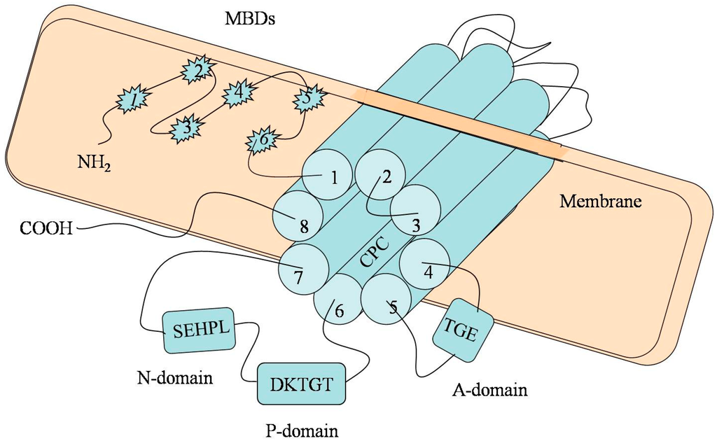 Diagram of ATP7B. The metal-binding domain contains six copper-binding domains (MBD1-6), all with the conserved sequence motif CXXC. The transmembrane channel consisting of eight discontinuous ion channels may contribute to copper transport (Cylinder1-8). The Cys–Pro–Cys (CPC) sequence motif is the key residue that confers metal ion selectively. ATP binds to the N-domain and the SEHPL motif located in the N-domain. The P-domain is the room for phosphorylation of Asp from the sequence DKTGT. The A-domain is the place where the acyl-phosphate gets dephosphorylated. Mutations may occur at any position of the gene, and then may cause the deposition of copper.