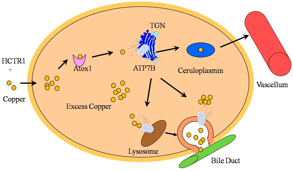 Copper is delivered by HCTR1 to cytosol where it mainly binds to Atox1. Atox1 transfers copper to TGN and is transported into the lumen with the help of ATP7B. Copper is then incorporated into ceruloplasmin which is then released to vascellum. The excess copper facilitates ATP7B trafficking from the TGN to the lysosome, then copper can be transported to the lysosomal lumen, and the excess copper is excreted to bile via exocytosis. An increasing level of copper also stimulates ATP7B to move to cytosolic vesicles where copper is isolated and then released into the bile duct.
