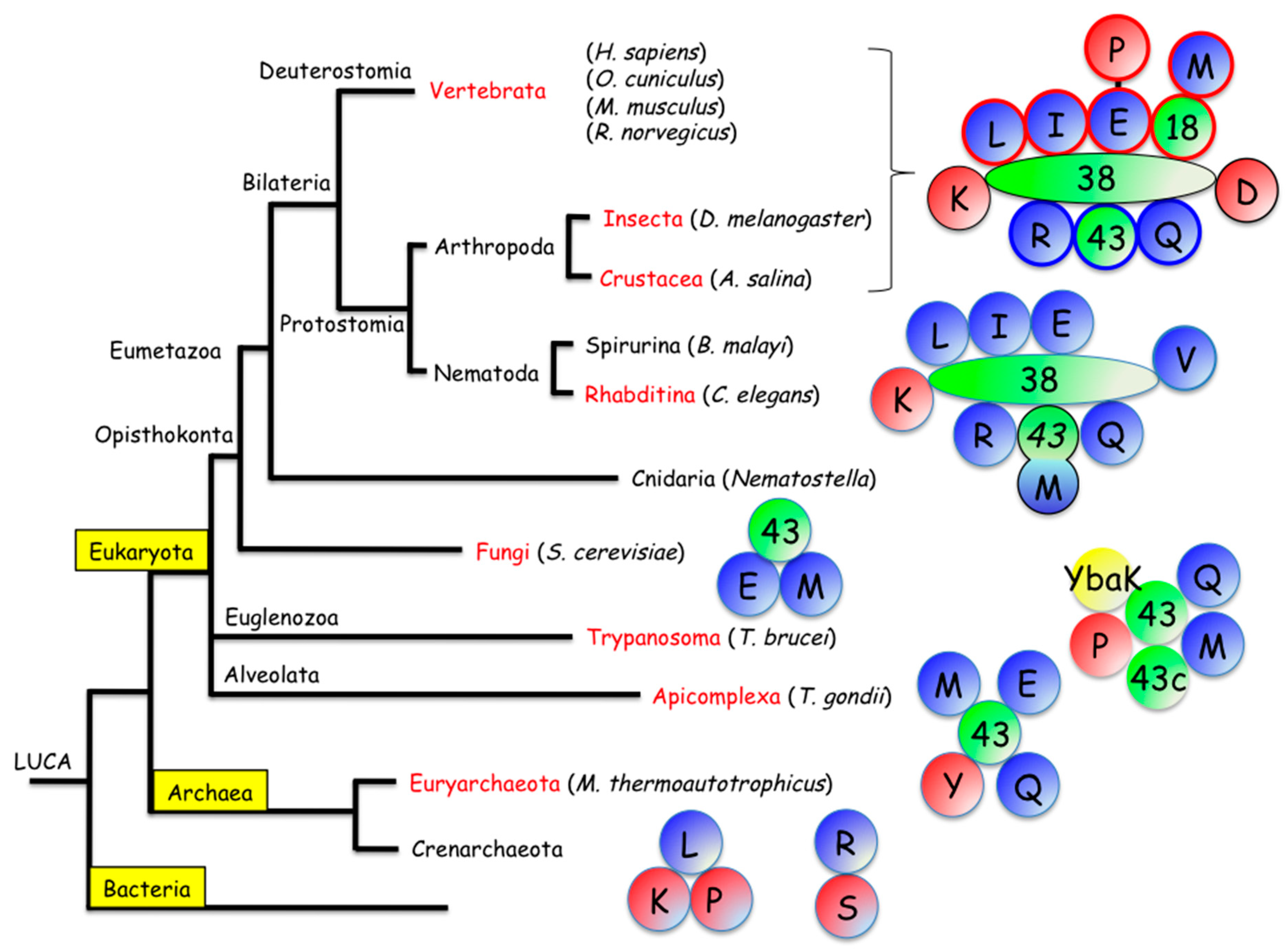 Occurrence of multi-aminoacyl-tRNA synthetase complexes of different compositions throughout the tree of life. A schematic view of the complexes described in Euryarchaeota, Apicomplexa, Trypanosoma, Fungi, Rhabditina, Crustacea, Insecta, or Vertebrata, is shown. The auxiliary proteins known to have a structural role within the complexes are presented in green. Class I synthetases are in blue; class II in red. Synthetases are indicated according to the one letter symbol of their amino acid substrate. The autonomous editing protein YbaK is in yellow. On the right are represented the complexes described in the literature. The complex isolated from vertebrata is composed of a scaffolding protein (p38), that joins sub-complex I (components circled in red), subcomplex II (components circled in blue), LysRS (K) and AspRS (D). In the complex from Rhabditina, the p43 and MetRS (M) proteins are fused in a single polypeptide. The scaffold protein of the complexes from Apicomplexa and Trypanosma have characteristics of p43 from vertebrates.