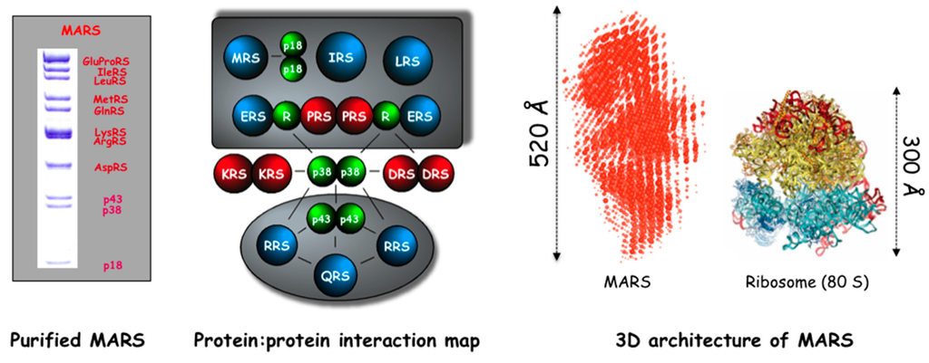 Composition, structural organization and 3D-architecture of the MARS. Left: SDS-PAGE analysis of the MARS from rabbit; Middle: protein:protein interaction map of the MARS, showing two subcomplexes linked by a scaffold protein, p38; Right: low resolution envelope of the MARS determined by SAXS (Small Angle X-ray Scattering). The crystal structure of the 80S ribosome is shown for comparison.