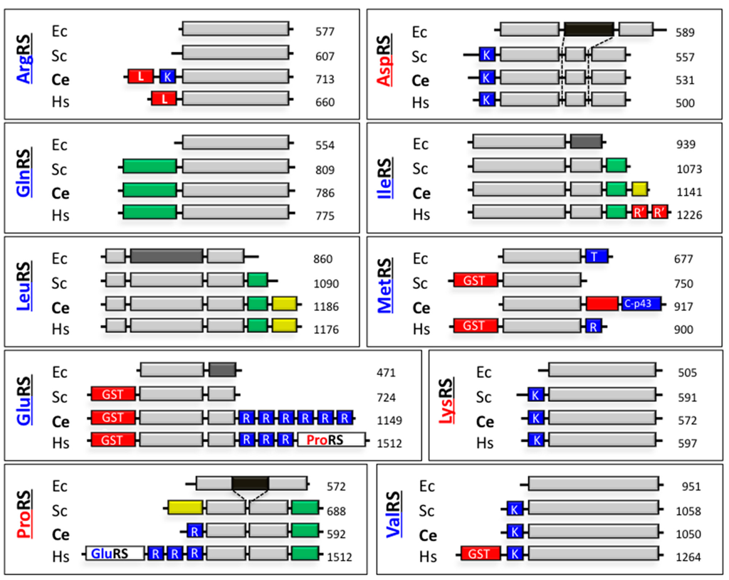 Schematic comparison of ten aminoacyl-tRNA synthetases from H. sapiens (Hs) with their homologs in E. coli (Ec), S. cerevisiae (Sc) and C. elegans (Ce). Conserved parts are shown in light grey with poorly conserved regions in medium grey. Dark grey boxes represent E. coli specific domains. The number of amino acid residues per polypeptide chain is indicated. Eukaryote specific domains, conserved from yeast to human, are shown in green. Appended domains found only in one or two species are in yellow. Protein–protein and protein–RNA interaction domains are shown in red and blue, respectively: L—leucine-rich domain; GST—glutathion S-transferase-like domain; R'—repeated sequence found in human IleRS; K—lysine-rich domain; R—repeat (WHEP) domain. The names of class I aaRS are highlighted in blue, of class II in red.
