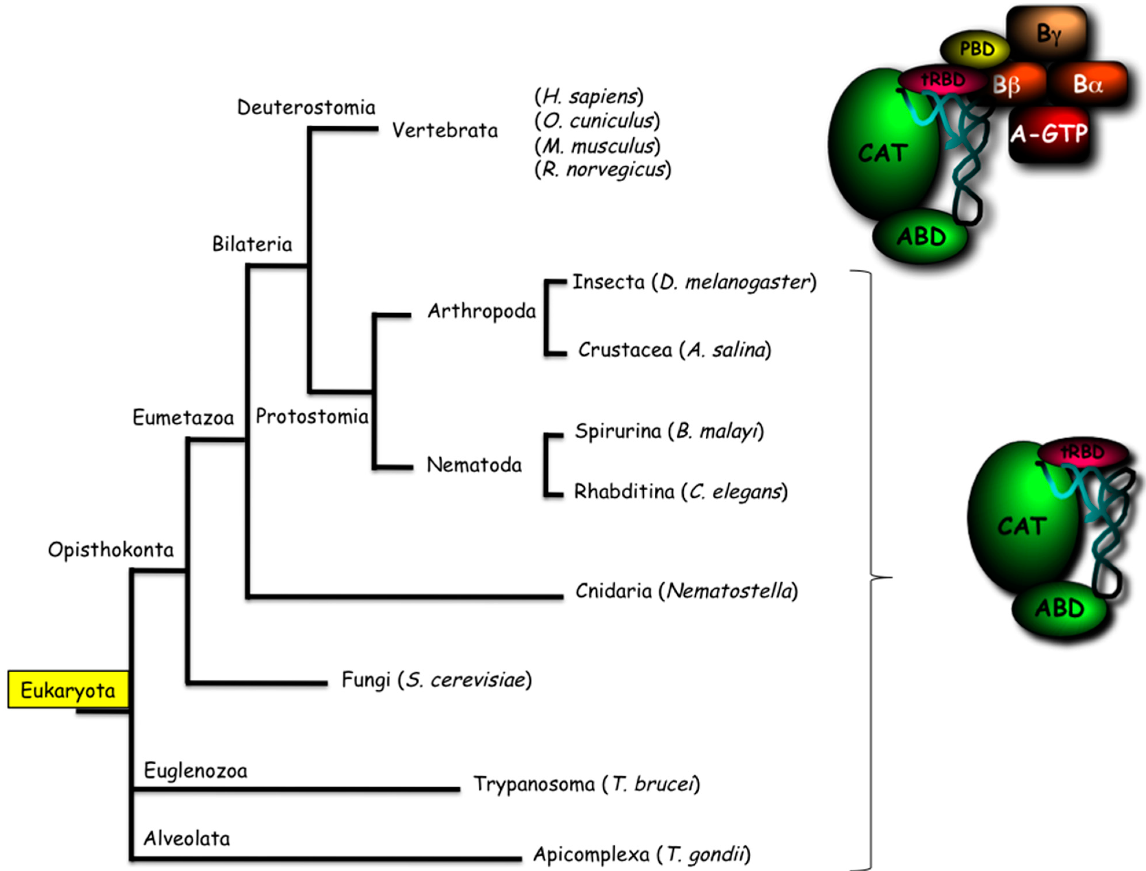 Occurrence of ValRS:EF1A:EF1B complexes or of “free” ValRS in Eukaryota. The conserved catalytic (CAT) and anticodon-binding (ABD) domains are in green. The appended tRNA-binding domain (tRBD) is indicated in red, the protein-binding domain (PBD) only recovered in Deuterostomia, required for association with elongation factor 1, is in yellow.
