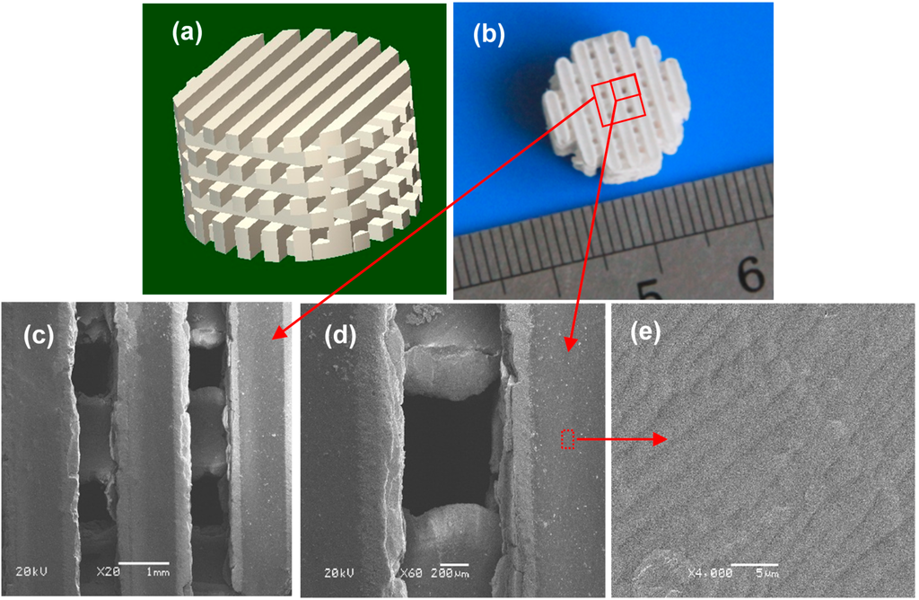(a) Computer-aided design (CAD) model of the scaffold; (b) Porous scaffold (machined into a cylinder); (c–e) Scanning electron microscopy (SEM) micrographs of the interconnected network channels.
