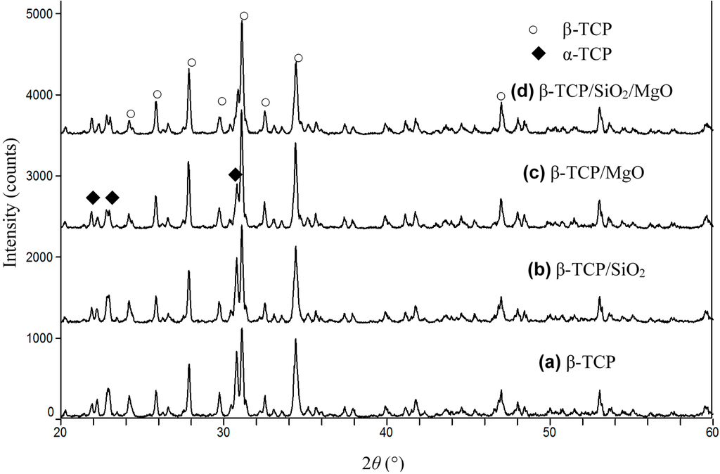 X-ray diffraction (XRD) patterns of (a) β-tricalcium phosphate (β-TCP); (b) β-TCP/SiO2; (c) β-TCP/MgO; and (d) β-TCP/SiO2/MgO.