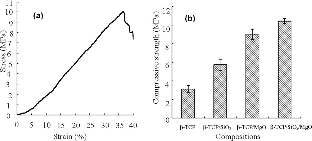 Carlisle verified that Si (up to 0.5 wt %) often localized in active growth areas and played an important role in bone formation and calcification []. SiO2/ZnO was doped into β-TCP scaffolds by Fielding et al. (2012). They proved that SiO2 and ZnO dopings increased the mechanical strength and facilitated cellular proliferation []. Bandyopadhyay et al. studied the effect of ZnO, SiO2 and SrO dopings on the mechanical and biological properties of β-TCP ceramics. And it was concluded that the dopings could tailor the strength and degradation behavior []. Ryu et al. introduced MgO into dense hydroxyapatite (HA)/β-TCP ceramics to improve the sintering ability. The results showed a transgranular fracture mode and enhanced mechanical properties of HA/β-TCP ceramics doped with 1.0 wt % MgO [].